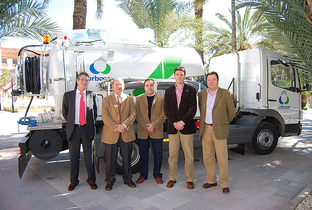 El alcalde del Ayuntamiento de Alhama de Murcia, Juan Romero, junto con el concejal de Obras y Servicios, Alfonso Fernando Cerón, el Director Regional de Urbaser, Ángel Laorden, el Director General de Aguas de Urbaser, Benito Hernández, y el Jefe de Servicios de la Oficina de Urbaser de la localidad, Alfonso Garrido, han presentado el nuevo vehículo de Urbaser, que a partir del día de hoy estará en activo en la localidad.