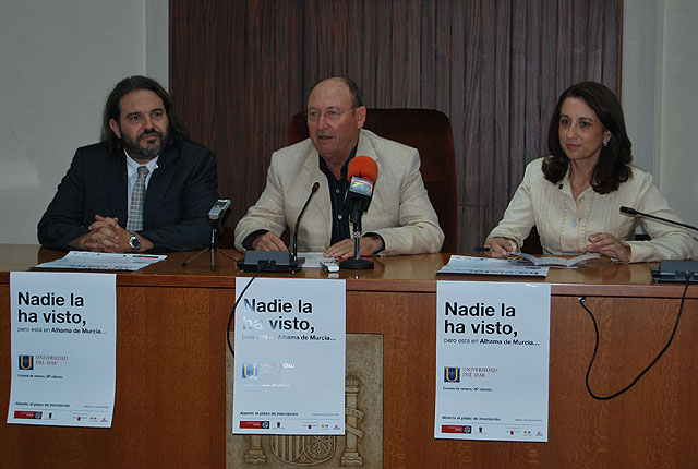 El Ayuntamiento de Alhama de Murcia acoge, un año más, dos cursos enmarcados en la programación de verano de la Universidad del Mar. En concreto, el alcalde del municipio, Juan Romero Cánovas, acompañado por la directora de la Universidad del Mar, Manuela López Tenés y el vicerrector de Extensión Universitaria, Francisco Guillermo Díaz Baños, presentaron los cursos “Balneoterapia. El uso médico de las aguas termales a través de la historia”, que tendrá lugar del 14 al 18 de septiembre y “El desarrollo rural en los espacios naturales protegidos y en la Red Natura 2000”, que se desarrollará del 21 al 25 de septiembre. Ambos cursos, destacaba López Tenés, cuentan con temáticas que en la actualidad despiertan un gran interés.