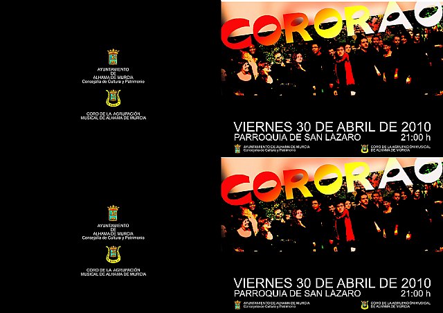 El Ayuntamiento de Alhama informa a través de la Concejalía de Cultura y Patrimonio que mañana, día 30 de abril, a las 21:00 Horas se va a realizar un concierto del grupo vocal “Cororao” en la Iglesia de San Lázaro.