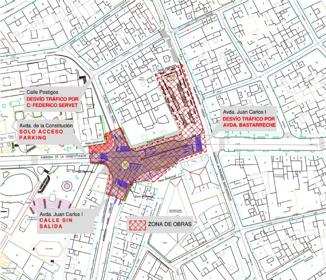 Fulgencio de la Cruz, concejal de Tráfico, daba la información esta mañana señalando que será necesario cortar las vías que confluyen en la zona (avenida Juan Carlos I desde avenida Bastarreche y avenida de La Constitución). A la avenida Constitución sólo tendrá acceso hacia el aparcamiento subterráneo. La avenida Juan Carlos I quedará sin salida hacia el centro y el tráfico por la calle Tomás Moro se desviará por Federico Servet.