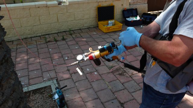 Debido a la aparición de los primeros casos de palmeras con picudo en e núcleo urbano de municipio y la proximidad de estas cuatro palmeras canarias singulares a los focos de infección, como es el cruce del Ral, el inicio del buen tiempo y la rapidez con que se desplaza esta plaga, especialmente destructiva en las zonas del levante mediterráneo, la Concejalía de Parques y Jardines decidió aplicar un primer tratamiento preventivo con un producto muy efectivo contra el picudo aplicado con una pistola de inyección con aire comprimido.