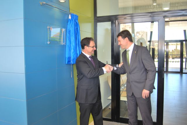 El delegado del Gobierno en la Región de Murcia, Joaquín Bascuñana, junto al alcalde de Alhama de Murcia, Alfonso Fernando Cerón, han inaugurado esta mañana el nuevo edificio polivalente del polideportivo El Praíco.