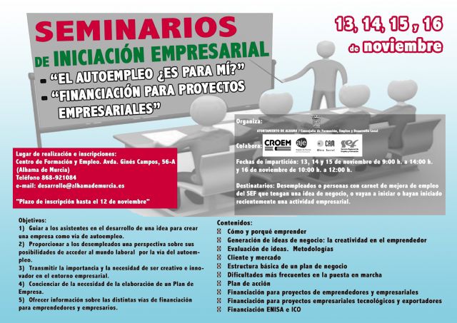 Hasta el 12 de noviembre está abierto el plazo para inscribirse en los seminarios de Iniciación Empresarial organizado por el Ayuntamiento de Ahama, a través de las concejalías de Formación, Empleo y Desarrollo Local en colaboración con la CROEM, AJE, la Obras Social de la CAM y el SEF.