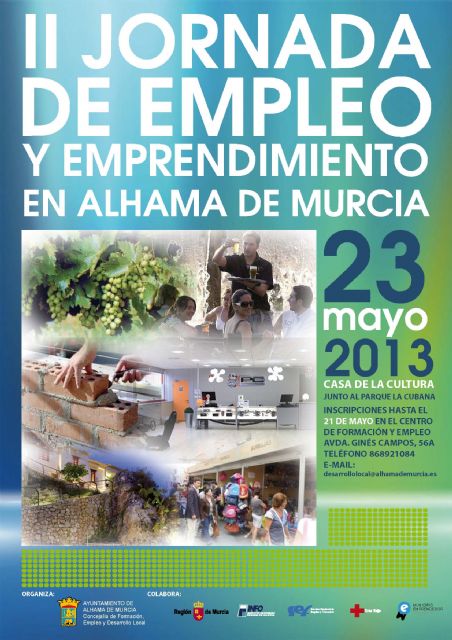 El Ayuntamiento de Alhama de Murcia, a través de la Concejalía de Formación, Empleo y Desarrollo Local, organiza la II Jornada de Empleo y Emprendimiento en Alhama de Murcia con la finalidad de difundir las actuales medidas de apoyo institucional al emprendimiento, las oportunidades de negocio y empleo local en distintos sectores económicos, las experiencias de motivación emprendedora en el ámbito educativo y los conocimientos y vivencias de los emprendedores alhameños que han sido apoyados técnica y económicamente desde el Ayuntamiento a lo largo de 2012 en la puesta en marcha de su actividad empresarial.