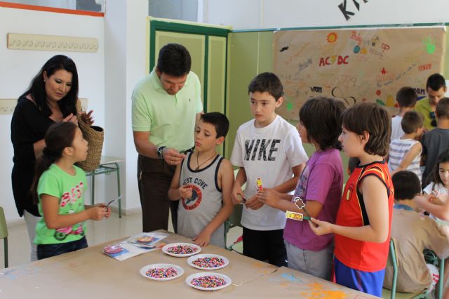 El alcalde de Alhama de Murcia, Alfonso Fernando Cerón Morales, acompañado por la edil de Bienestar Social, María Carmen Díaz, visitaban el Taller de Dinamización Social que se viene desarrollando, desde principios del mes de julio, en el C.P. Antonio Machado.