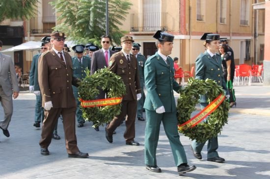 A las doce de la mañana llegaba el cuerpo militar hasta la iglesia de San Lázaro acompañado por la banda de la Hermandad de la Virgen de los Dolores y la Soledad. En la parroquia, tenía lugar una misa en la que estaba presente el alcalde de Alhama de Murcia así como diversos miembros de la Corporación municipal. A su término, en el mismo atrio de San Lázaro, al son del himno nacional, como es preceptivo, era izada la bandera que nos representa a todos los españoles por dos miembros del cuerpo de la benemérita. Asimismo, se colocaban dos coronas de laurel en recuerdo de los miembros desaparecidos del cuerpo.