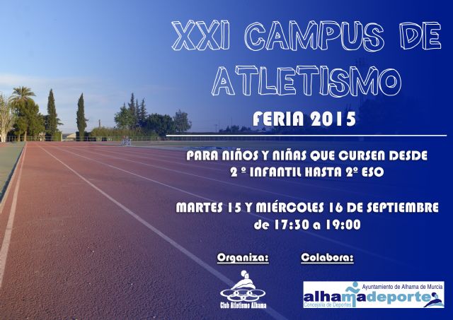 El Club Atletismo Alhama, con la colaboración del Excmo. Ayuntamiento de Alhama de Murcia a través de su Concejalía de Deportes, organiza la vigésima primera edición de su campus de atletismo.