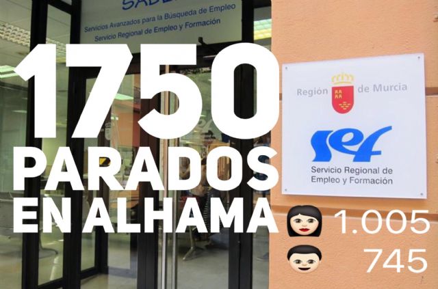 El número de desempleados registrados en la oficina del Instituto Nacional de Empleo (Inem) en Alhama de Murcia al término del mes de junio se situó en 1.750 personas, 32 personas más que en mayo, según datos difundidos este lunes por el Ministerio de Empleo y Seguridad Social.