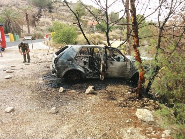 Tras avisar al 112, los bomberos se personaron en el lugar y lograron apagar el fuego, que destruyó unos cien metros cuadrados de leña y matorral, cuatro pinos, una caja de telefonía y el turismo, evitando así un incendio forestal en pleno pulmón de la Región de Murcia.