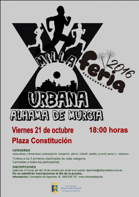El próximo viernes día 21 de octubre está previsto que se celebre la décima edición de la Milla Urbana Feria de Alhama de Murcia, organizada la concejalía de Deportes. El circuito recorrerá las calles Avenida Sierra Espuña, Postigos, Tomás Moro y parte de Juan Carlos I, para completar los 1.609 metros que tendrán que recorrer los participantes. Dará comienzo a las 18 horas con las primeras carreras, correspondientes a las categorías prebenjamines.
