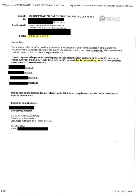 Después de un mes y medio esperando que la Comunidad Autónoma se ponga en contacto con el Ayuntamiento para interesarse por los daños ocasionados en Alhama por las lluvias del mes de diciembre, este pasado viernes enviaban un correo electrónico para que en MENOS DE DOS HORAS se les remitiera una cuantificación de los daños.