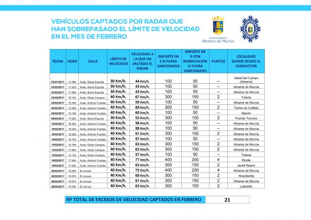 Del total de vehículos que han pasado por el objetivo del radar este mes, 21 de ellos han rebasado la velocidad máxima establecida por el cinemómetro, registrándose los excesos en las avenidas Sierra Espuña, Ginés Campos y Antonio Fuertes, y en la zona de El Vínculo. Entre ellos ha habido 11 conductores de la localidad y 10 de otros municipios, quienes recibirán en su domicilio una nota informativa mostrándoles las ventajas de mantener una conducción responsable.