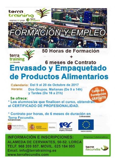 Terra Fecundis, agencia de colocación y empresa de trabajo temporal (ETT) especializada en el trabajo dentro del sector hortofrutícola, tanto en Francia como en España, realiza un curso de envasado y empaquetado de productos alimentarios con 6 meses de contratación por horas. Tras su finalización se ofrecerá un diploma acreditativo con certificado de profesionalidad.