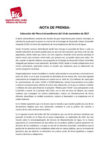 El pleno extraordinario contenía dos asuntos de gran importancia para nuestro municipio, la solicitud de ayuda para la puesta en marcha de la Estrategia de Desarrollo Urbano Sostenible Integrado (DUSI) y el inicio del expediente de remunicipalización del Servicio de Aguas.