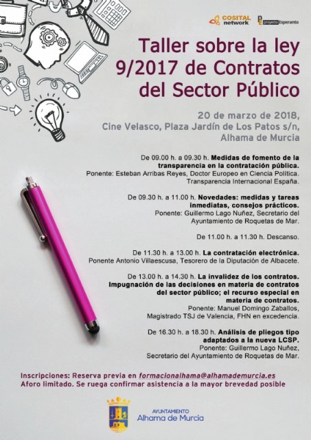 El martes 20 de marzo tiene lugar en el Teatro Cine Velasco un taller sobre la Ley 9/2017 de Contratos del Sector Público, organizada por el Ayuntamiento de Alhama de Murcia.