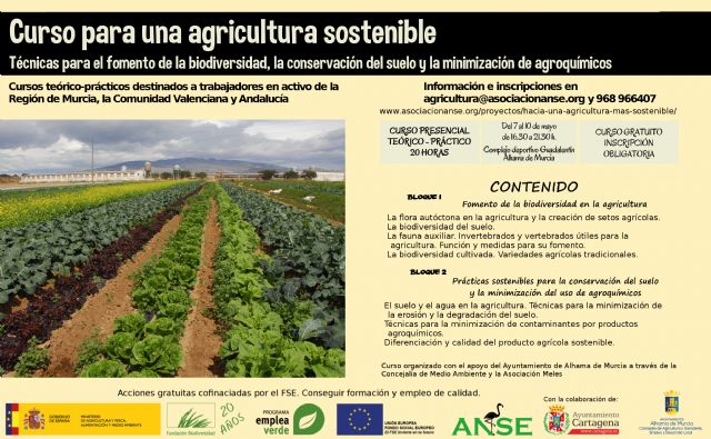 El Ayuntamiento de Alhama de Murcia, a través de las concejalías de Agricultura y Ganadería, Empleo y Desarrollo Local, junto con la Asociación Meles, colabora en el 'Curso para una agricultura sostenible. Técnicas para el fomento de la biodiversidad, la conservación del suelo y la minimización de agroquímicos', organizado por ANSE (https://www.asociacionanse.org) y destinado a trabajadores en activo de la Región de Murcia, la Comunidad Valenciana y Andalucía.