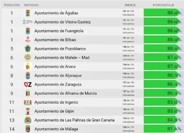 Nuestro ayuntamiento ha subido de 131 a 137 indicadores en el último año, de un total de 159, lo que supone cumplir un 86,16%, y espera en breve alcanzar los 141 para situarse a la cabeza del país junto a Águilas, Vitoria-Gasteiz, Fuengirola y Bilbao.