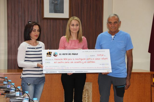 El municipio de Alhama de Murcia ha colaborado en la iniciativa 'El reto de Pablo', recaudando dinero a través de huchas distribuidas desde el Consistorio en comercios, locales de hostelería y centros educativos locales. La concejala de Sanidad, Marola Guevara, ha entregado un cheque con el total del dinero recibido, 1.004,61 euros, a Margarita Vicente, presidenta de la Asociación Española Contra el Cáncer en Totana, y a Gregorio Martínez, miembro de la campaña. El importe irá destinado íntegramente a la Asociación NEN, de familiares y amigos de pacientes con Neuroblastoma.