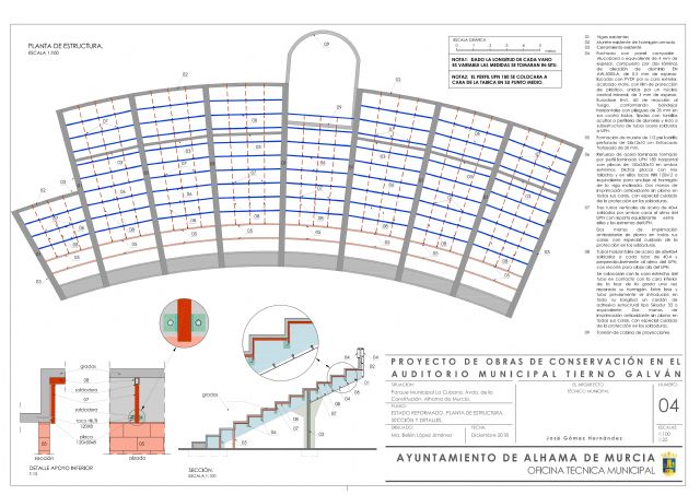 Las actuaciones que se van a acometer consisten en la estabilización de la corrosión y reparación del hormigón de las gradas para dotar de mayor durabilidad el conjunto. Los refuerzos serán metálicos instalados debajo del graderío y anclados al hormigón sano de las vigas.
