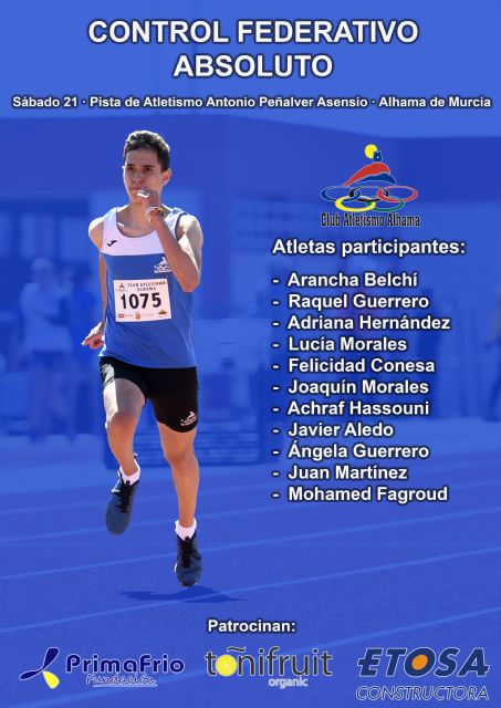 Este próximo sábado, un total de once atletas del Club Atletismo Alhama participarán en el 'Control Federativo Absoluto' que celebrará la Federación de Atletismo de la Región de Murcia en la 'Pista de Atletismo Antonio Peñalver Asensio' de Alhama de Murcia, siendo esta, la última competición en pista que se celebrará este año.