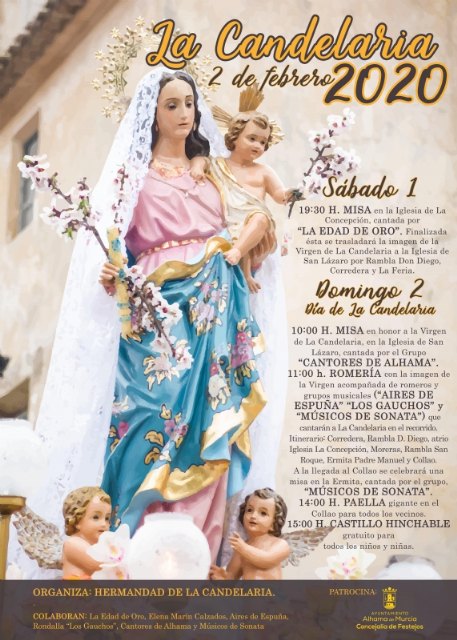 11.00 h. ROMERÍA con la imagen de la Virgen acompañada de romeros y grupos musicales (‘Aires de Espuña, ‘Los Gauchos’ y ‘Músicos de Sonata’) que cantarán a la Candelaria en el recorrido. Itinerario: Corredera, rambla D. Diego, atrio iglesia de la Concepción, Moreras, rambla San Roque, Ermita Padre Manuel y Collado. En la ermita de ‘El Collao’, a la llegada de la Virgen, se celebrará una misa cantada por el grupo ‘Músicos de Sonata’.