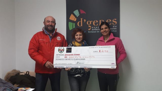 El Motoclub Alhama ha hecho entrega a la Asociación de Enfermedades Raras D´Genes de un cheque por importe de 1.250 euros correspondiente a la recaudación de la prueba del Campeonato regional de Motocross celebrada en Alhama de Murcia el pasado 20 de octubre.