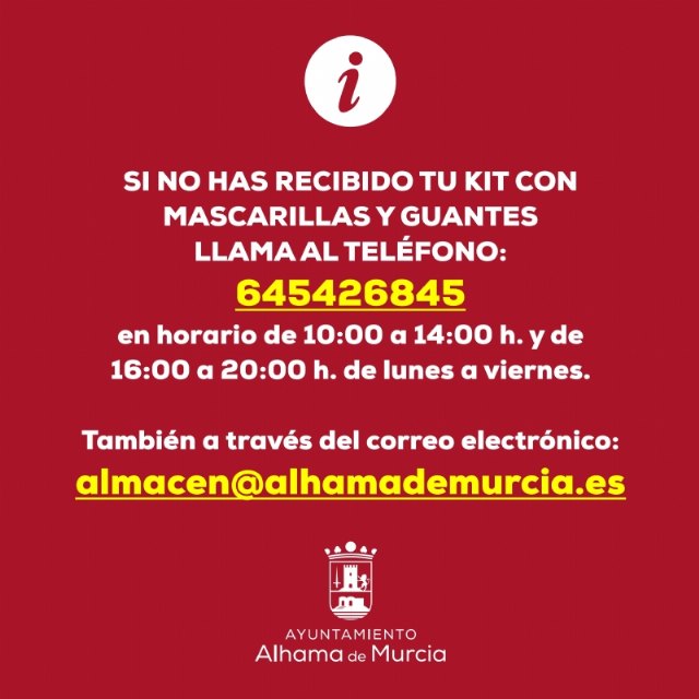 El teléfono habilitado para solicitar estos elementos de protección en caso de no haberlos recibido es: 645426845 en horario de 10:00 a 14:00 y de 16:00 a 20:00 de lunes a viernes. También se puede hacer a través del correo electrónico: almacen@alhamademurcia.es