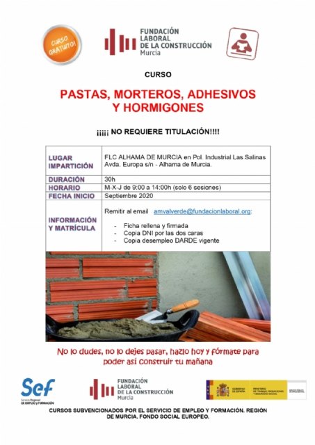 La Fundación Laboral de la Construcción organiza un curso gratuito de pastas, morteros, adhesivos y hormigones en su sede del Parque Industrial de Alhama de Murcia (avda. Europa s/n). No requiere titulación y está dirigido a personas desempleadas.