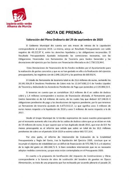 El Gobierno Municipal dio cuenta con seis meses de retraso de la Liquidación correspondiente al ejercicio 2019. La misma, arroja un Resultado Presupuestario con saldo negativo de 49.222,97 €, entre los derechos liquidados y las obligaciones reconocidas. El Resultado Presupuestario Ajustado incluyendo las correcciones necesarias, con las Obligaciones Financiadas con Remanentes de Tesorería para Gastos Generales y las desviaciones del ejercicio por los Gastos con Financiación Afectada es de 2.758.523,94 €.