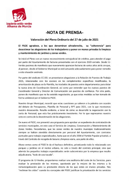 Por parte del sindicato CC.OO. se presentaron alegaciones a la Relación de Puestos de Trabajo 2021, relacionadas con: los excesos en los complementos específicos modificados, la amortización de plazas en la Plantilla, los traslados de puestos entre departamentos para dotar la nueva área de Coordinación General, así como por entender que los nuevos puestos de Coordinador General y Director de Comunicación son puestos de confianza. Por otra parte, ponen de manifiesto que no ha existido negociación, ya que estas medidas se han tomado de forma unilateral por el Gobierno PSOE.