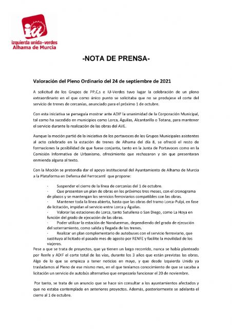 Valoración del Pleno Ordinario del 24 de septiembre de 2021. IU-verdes Alhama de Murcia