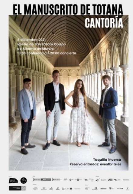 Tras su descubrimiento en 2017, el grupo vocal Cantoría, dirigida por Jorge Losana interpretará, por primera vez en vivo en la Región de Murcia, 'El Manuscrito de Totana', un documento con obras del siglo XVI encontrado en 2017 en la Iglesia de Santiago 'El Mayor' de Totana (Región de Murcia). Será el próximo viernes 3 de diciembre a las 20:00 h. en la propia Iglesia de Santiago 'El Mayor' de Totana y el 4 de diciembre a las 20:00 h. en la Iglesia de San Lázaro Obispo de Alhama de Murcia.