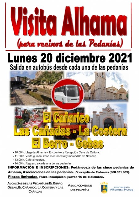 La concejalía de Pedanías, con motivo de la programación navideña, ha organizado para el lunes 20 de diciembre una visita a Alhama para que los residentes en las pedanías puedan acercarse en autobús al casco urbano a modo de excursión, para visitar, entre otros lugares, el mercadillo de Navidad.