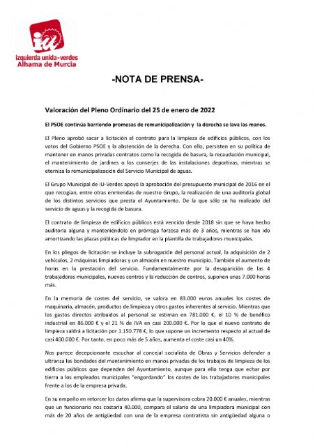 Valoración del Pleno Ordinario del 25 de enero de 2022 IU-verdes