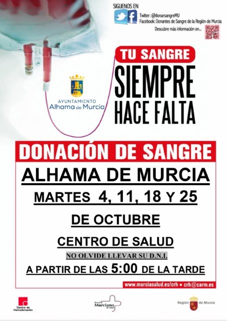 La concejalía de Salud presenta una nueva campaña de donación de sangre, organizada por el Centro Regional de Hemodonación, que tendrá lugar en el mes de octubre en Alhama de Murcia en las siguientes fechas: