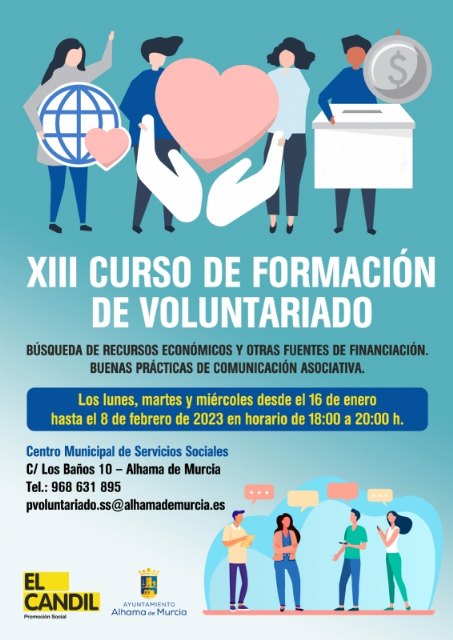 Las inscripciones se podrán realizar hasta el 7 de enero en el centro municipal de Servicios Sociales, situado en calle Los Baños, 10. Más información al teléfono 968 631 895 o al correo electrónico pvoluntariado.ss@alhamademurcia.es