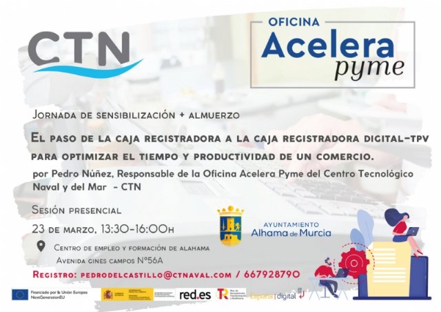 El Centro Tecnológico Naval y del Mar (CTNAVAL) presenta, en colaboración con el proyecto estatal Acelera PYME y el Ayuntamiento de Alhama, una nueva charla formativa para el próximo jueves, 23 de marzo.