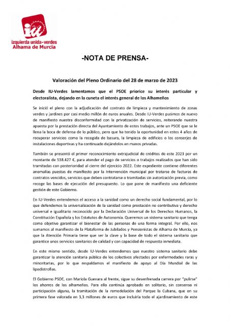 Valoración del Pleno Ordinario del 28 de marzo de 2023