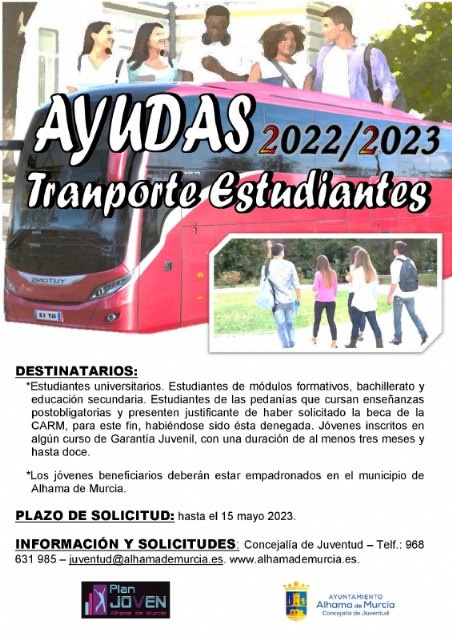 La concejalía de Juventud del Ayuntamiento de Alhama de Murcia informa de las ayudas de transporte dirigidas a estudiantes universitarios del curso 2022-2023.