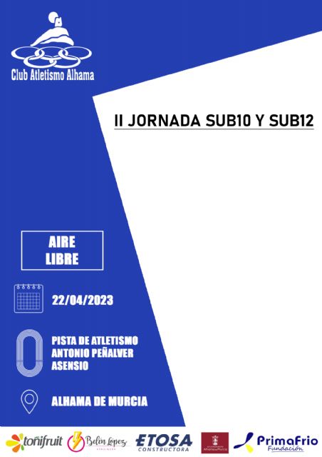 Este fin de semana, la Pista de Atletismo 'Antonio Peñalver Asensio' de Alhama de Murcia, acogerá la 'II Jornada Sub10 y Sub12', organizada por el Club Atletismo Alhama, la Federación de Atletismo de la Región de Murcia y el Ayuntamiento de Alhama de Murcia.