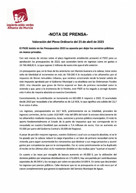 Un presupuesto que, en la línea de los anteriores con Mariola Guevara a la cabeza, tiene como seña de identidad el incremento en más de 700.000 € lo recaudado a los alhameños por el Impuesto de Bienes Inmuebles Urbanos, que venimos arrastrando desde la brutal subida de este impuesto aprobada por el Gobierno Municipal y su alcaldesa con las Ordenanzas Fiscales 2020. Una situación que grava de forma especial un bien de primera necesidad como la vivienda y que, pese a la insistencia de IU-Verdes, este PSOE se ha negado a corregir durante esto 4 años de mayoría absoluta en nuestro Consistorio.