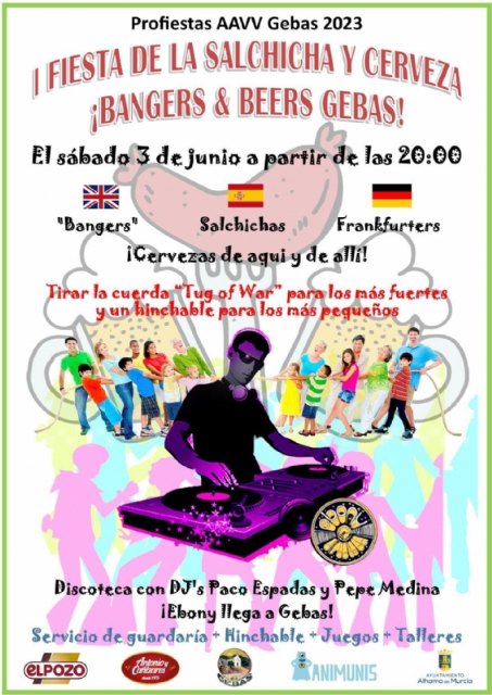 La Asociación de Vecinos de Gebas, en colaboración con el Ayuntamiento de Alhama de Murcia y empresas del municipio, organiza este sábado 3 de junio la 'I Fiesta de la Salchicha y Cerveza' (¡Bangers & Beers Gebas!).