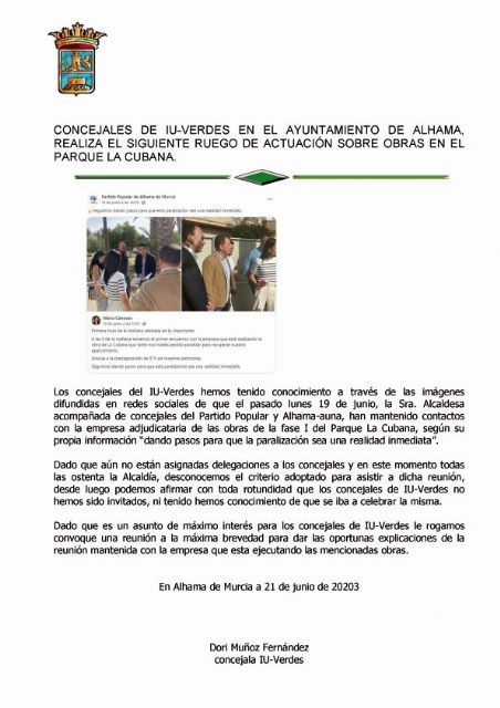 IU Alhama lucha por la transparencia: La Alcaldesa excluye a concejales en la reunión con la empresa del proyecto de la Cubana STV