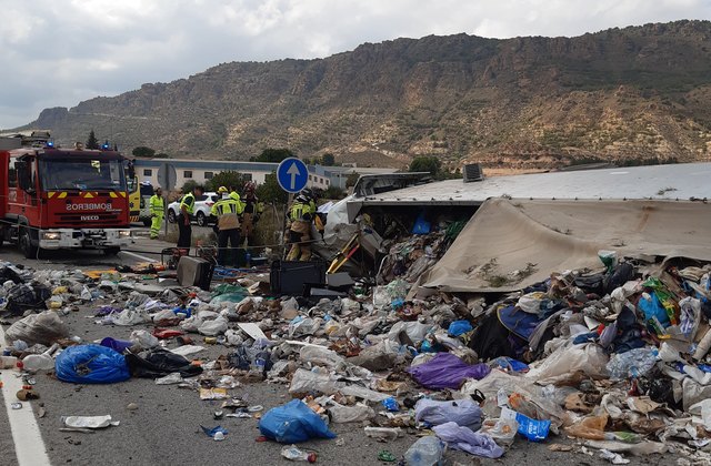 Los llamantes informaban de que un camión de basura había volcado en la salida del Pozo, en el término municipal de Alhama de Murcia, y que la cabina se encontraba totalmente aplastada.