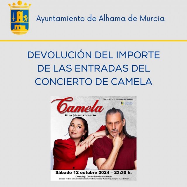 Desde la Concejalía de Festejos del Ayuntamiento de Alhama de Murcia, se informa que, desde mañana, miércoles 16 de octubre, se procederá a la devolución del importe íntegro de las entradas compradas de manera física para el concierto de Camela, que tuvo lugar el pasado 12 de octubre.