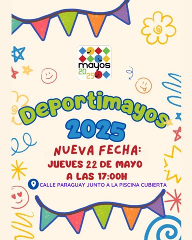 El Ayuntamiento informa a todos los vecinos/as y participantes que, debido a la previsión de lluvias para el próximo jueves 15 de mayo, la actividad DeportiMayos ha sido aplazada.